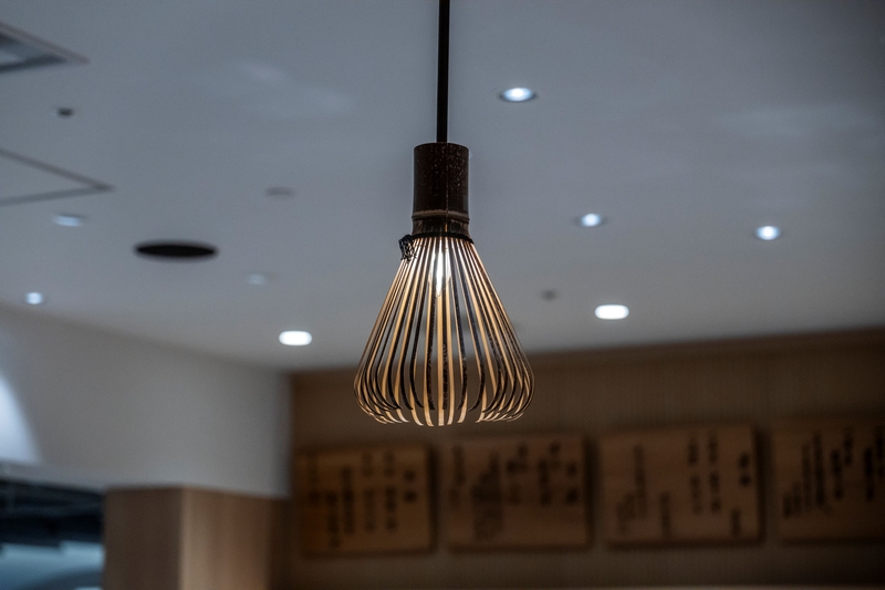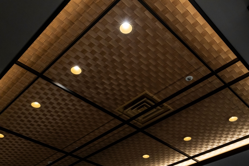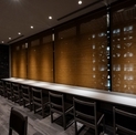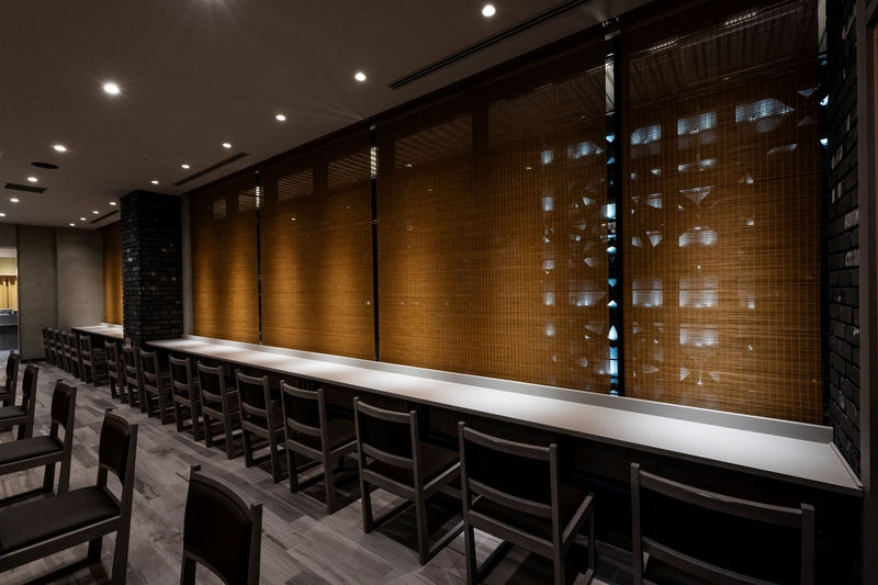 柱には青錆色を用いて重厚感を持たせ、カウンター天井部には網代天井を用いてシンプルながら「和」を感じれる様に考えた。