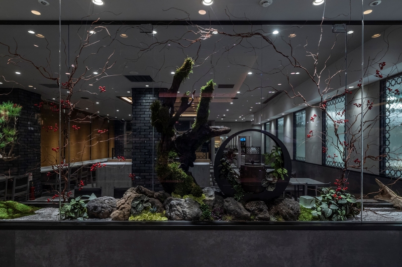 この通路には腰壁部に箱庭を設け茶寮内部が感じれる「間」をつくった。